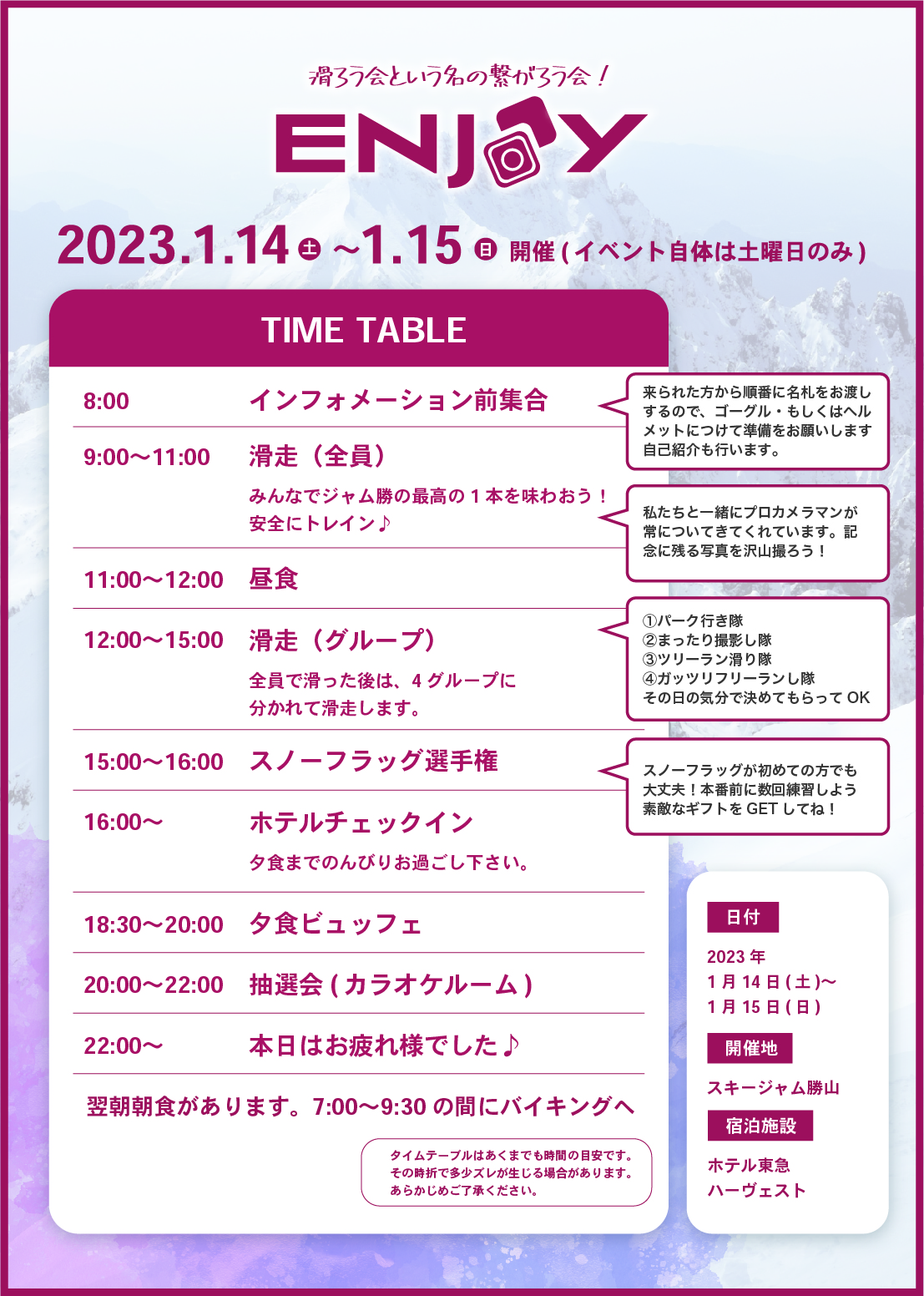 2023年1月14日(土)〜1月15日(日)滑ろう会ENJOYinスキージャム勝山を開催いたします。西日本最大級のゲレンデと参加者全員で過ごすより深い交流の時間をお楽しみください。