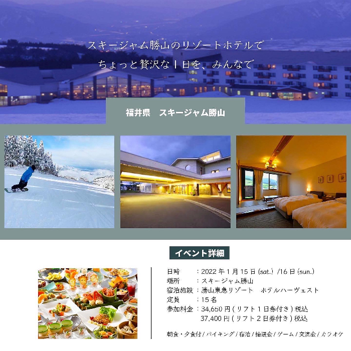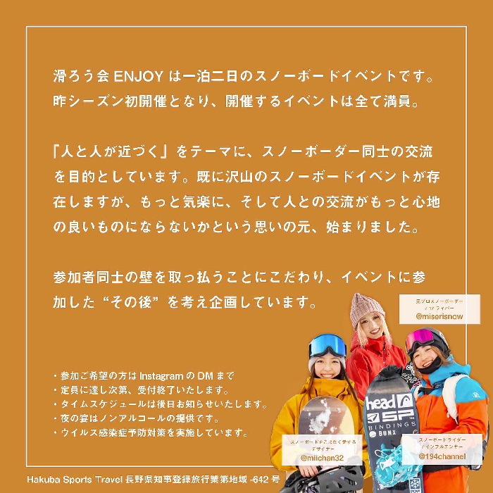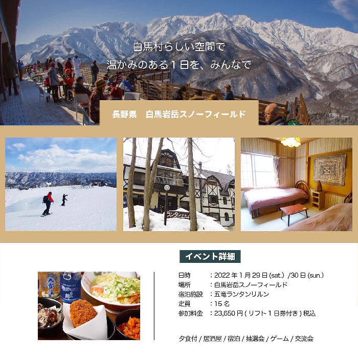 こちらのイベントは終了いたしました 滑ろう会ENJOY2021-2022 ■福井県 / スキージャム勝山スキー場 2022年1月15日(土)-1月16日(日) ■長野県 / 白馬岩岳スノーフィールド 2022年1月29日(土)-1月30日(日) Post Share Hatena LINE RSS feedly Pin it note 2021年野沢温泉BCツアー 前の記事 マイルン&ENJOY オフ会イベント 〜シーズンお疲れ様でした!〜 次の記事