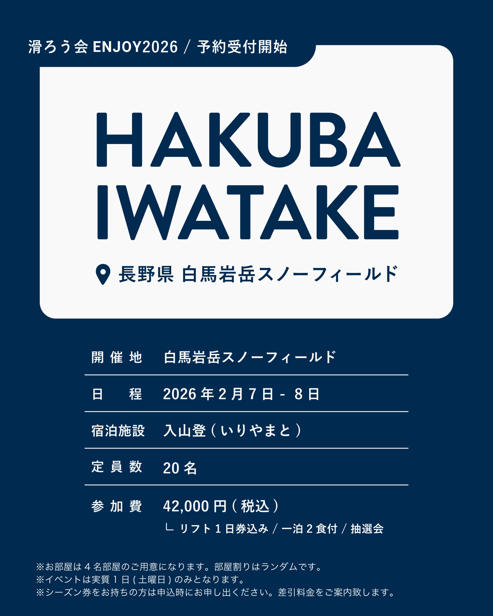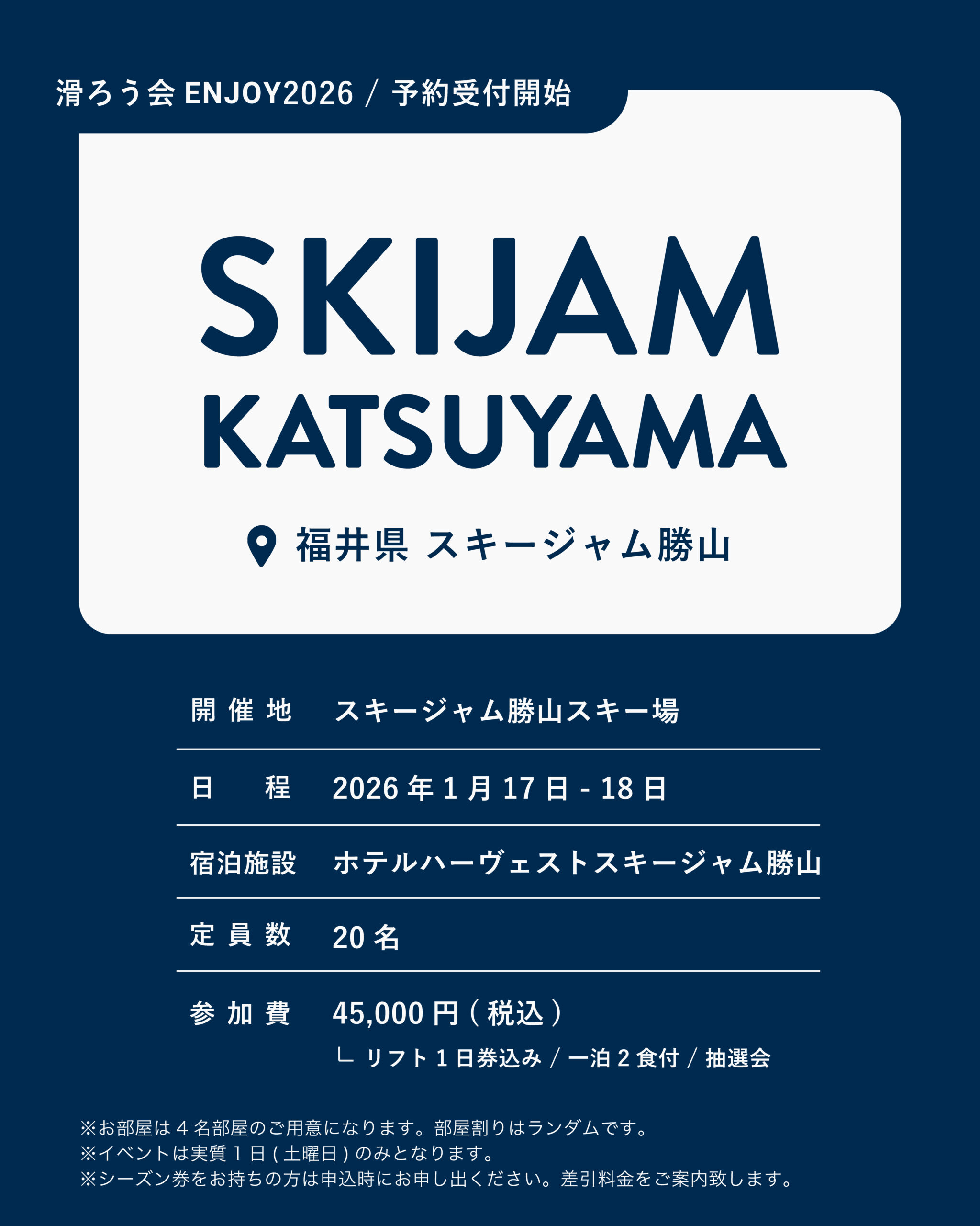 お待たせしました!「滑ろう会ENJOY 2026」の詳細がついに公開されました。今シーズンは、スキージャム勝山(福井県)・白馬岩岳(長野県) の2エリアを中心に開催。宿泊イベントはこの2つの開催地に絞り、より深く交流できる「ENJOYらしい時間」を大切にした形で実施していきます。